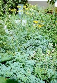 Weinraute Ruta graveolens “Die Weinraute ist gut gegen die trockenen Bitterkeiten, die in jenem Menschen wachsen, in dem die richtigen Säfte fehlen.....Und wenn sie gegessen ist, unterdrückt sie die unrechte Hitze des Blutes im Menschen. Denn die Wärme der Raute vermindert die unrechte Wärme der Melancholie. Und so wird es dem Menschen der melancholisch ist, besser gehen, wenn er sie nach anderen Speisen ißt.” Anwendung: Bei Depressionen, Hormonregulationsstörungen, Wallungen, Zwischenblutungen, Diabetes, Gallenstau, Verdauungsstörungen, Duodenalulkus, zu starker, schmerzhafter Menstruation. Verwendung: Kleingehackt eignen sich die stark aromatischen Blätter als Zugabe zu Spinat, Käse- und Quarkspeisen, auf Butterbrot, in Wildbretbeize, zu gekochtem Fisch und Lamm.